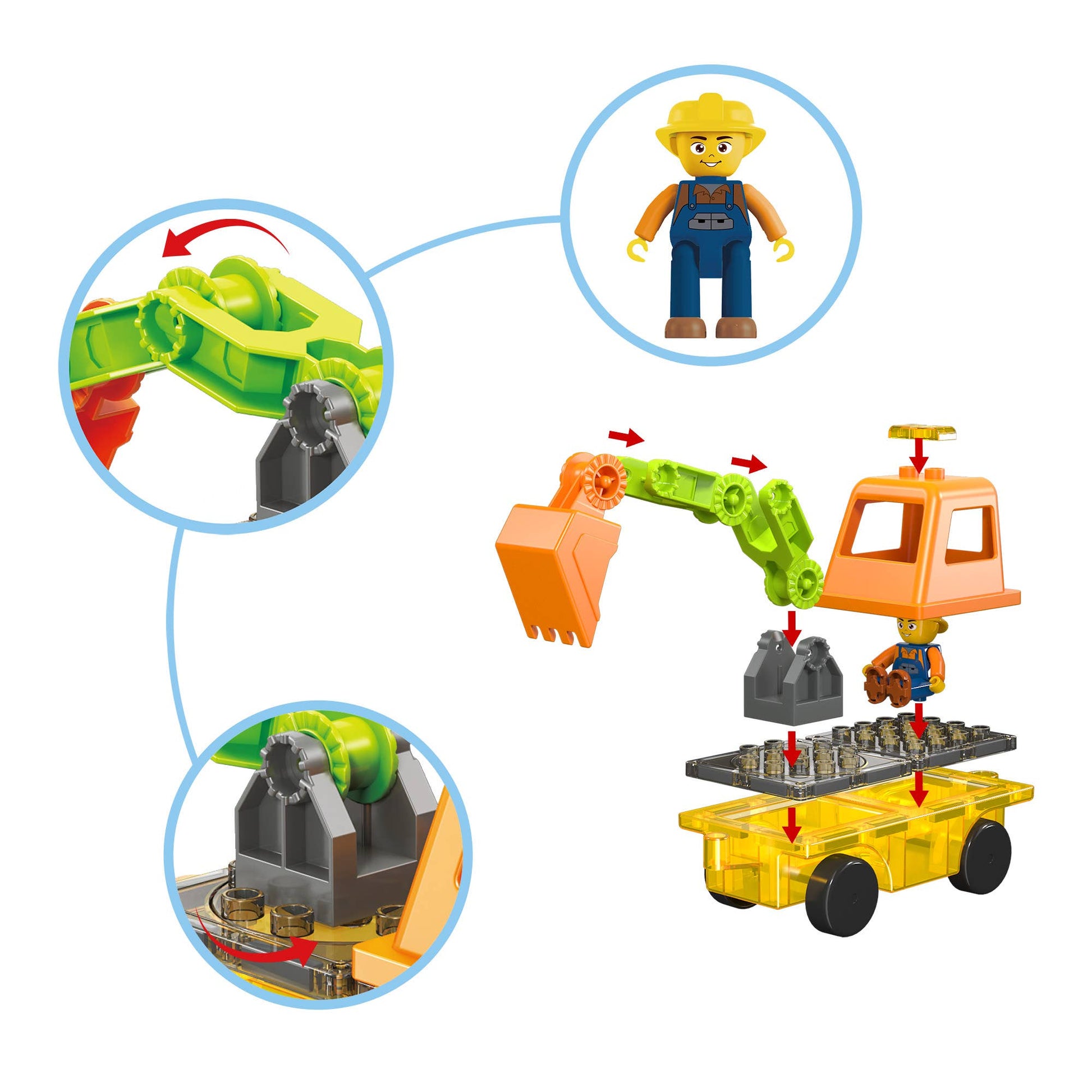 DREAM BIG & BUILD BIG: This 16-piece 2-in-1 playset is compatible with other PicassoTiles interlocking building bricks and magnet tiles. It features an action figure, car base, backhoe, and excavator. The magnetic character action figure has omnidirectional arms and legs, allowing you to rotate them around its body for more versatility and creative play. Easily switch this toy between an excavator or bulldozer, mix and combine it with different building blocks, and watch your creativity soar!