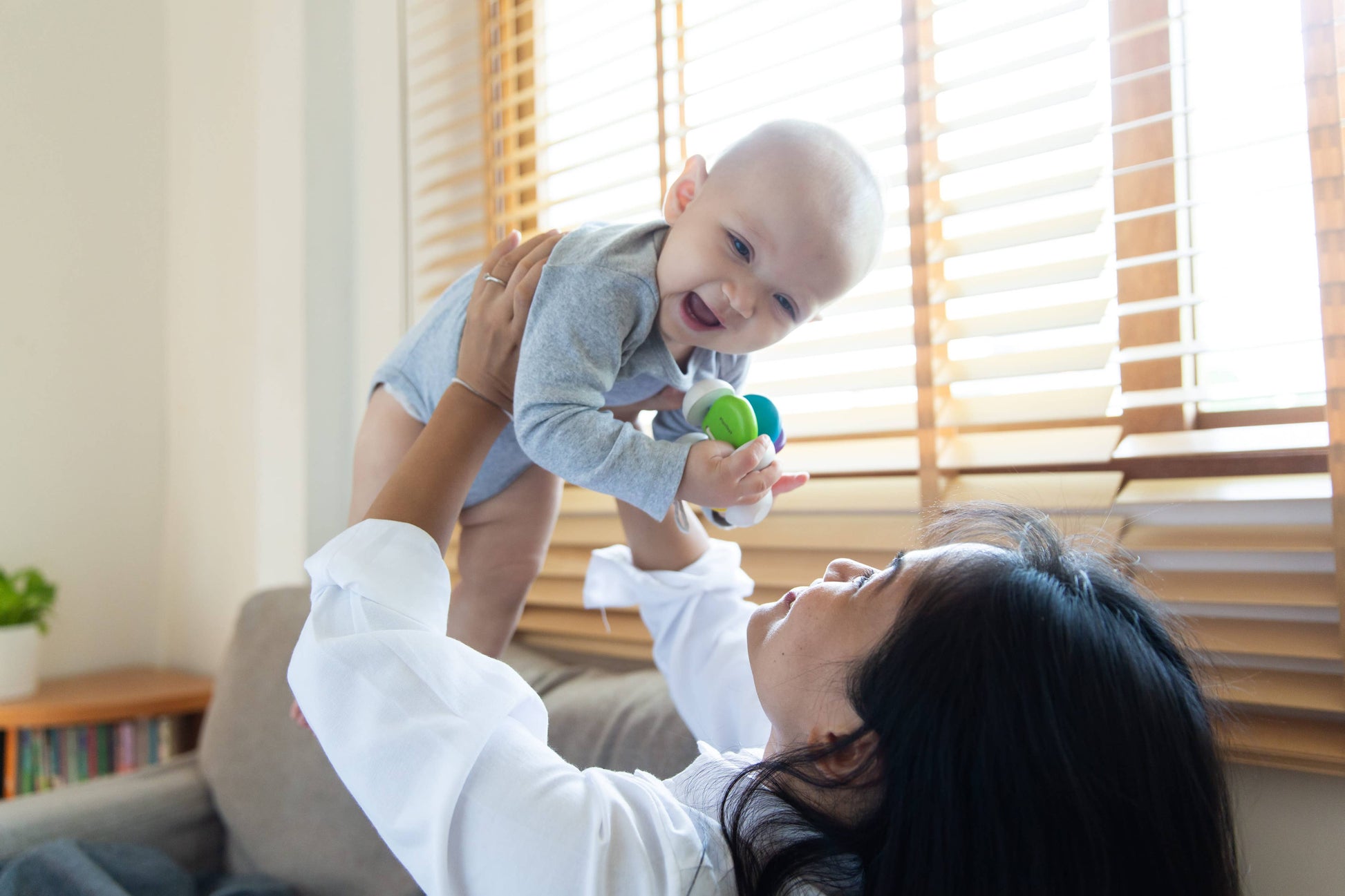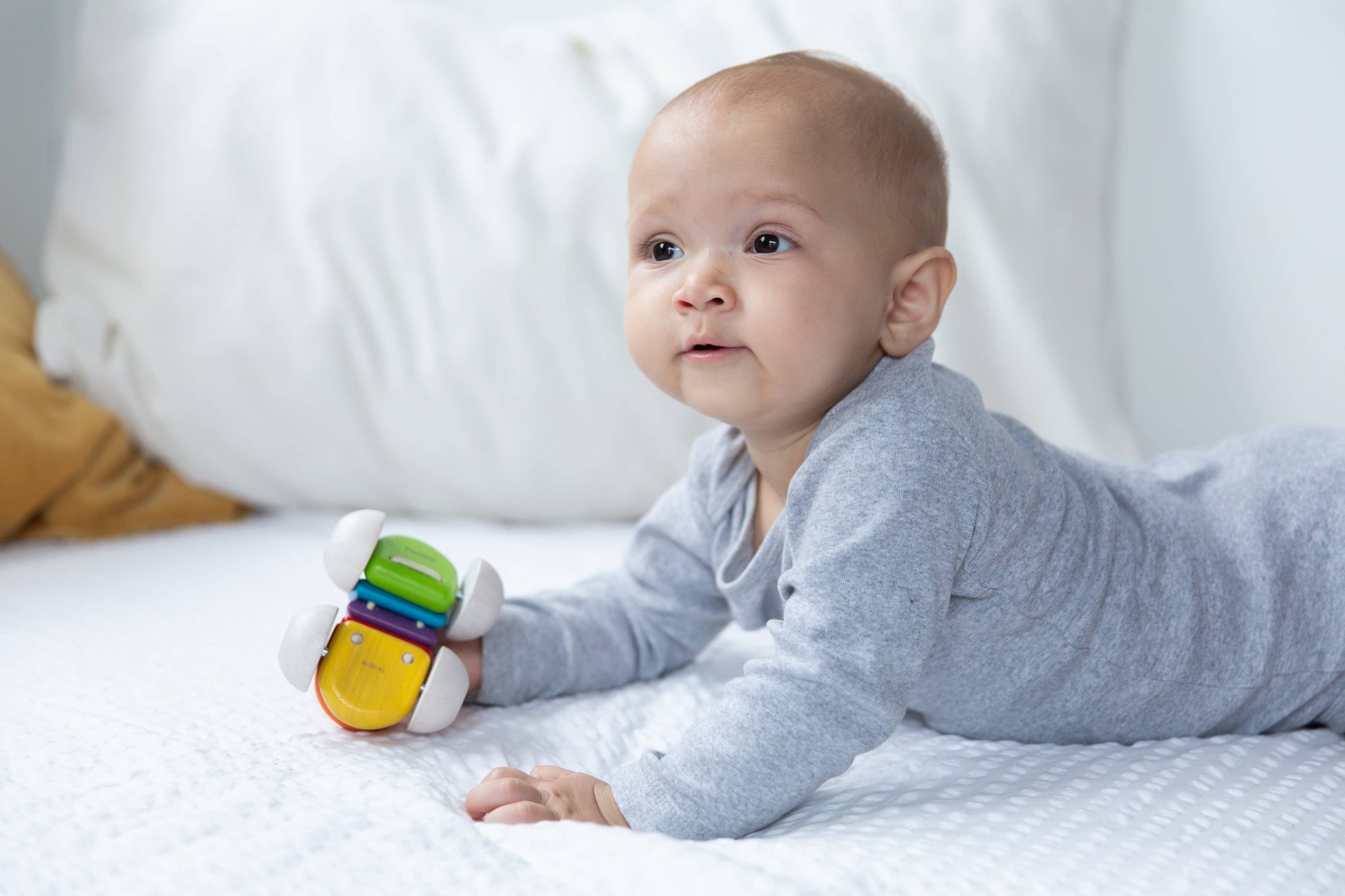 This colorful toy car has a flexible body that reacts to your baby’s touch. Helps build visual and fine motor skills.
