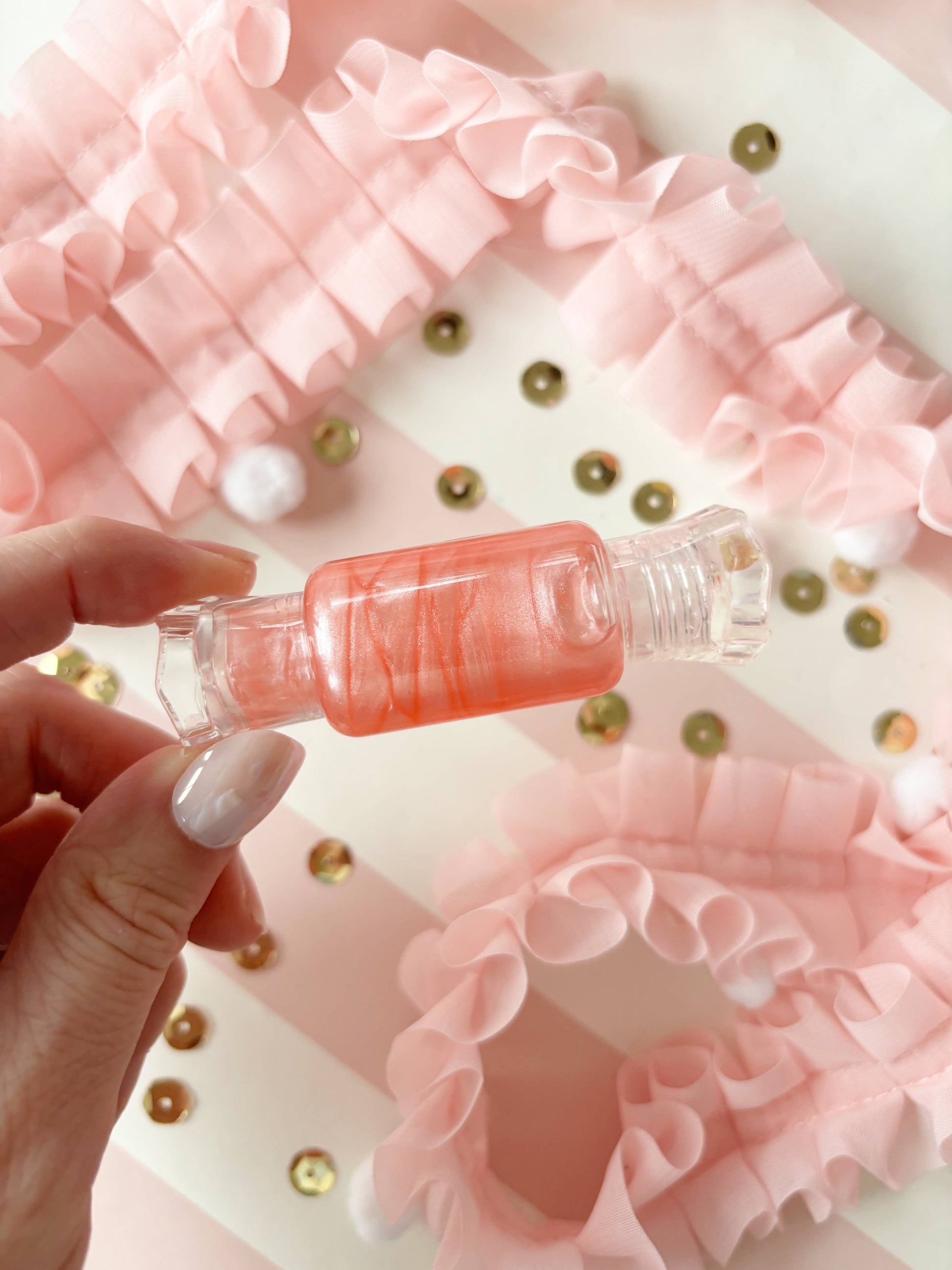 Strawberry flavored pink candy lip gloss! These are so much fun and leave your lips feeling soft and smooth!