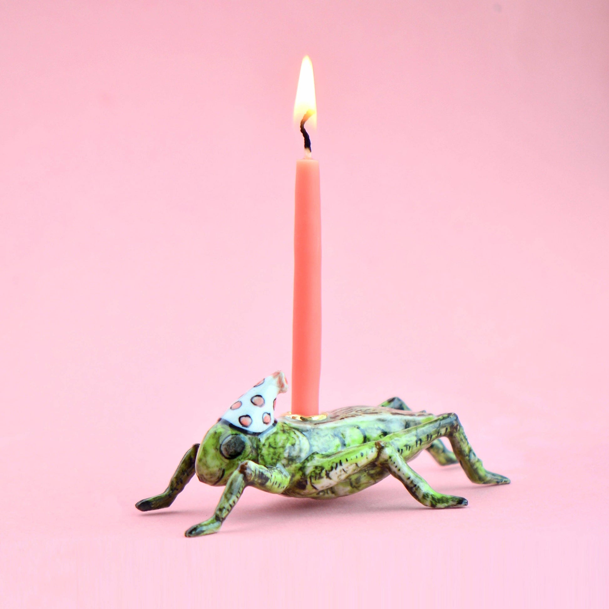 Bring a little extra luck to all of your birthdays, anniversaries, and other special occasions with our porcelain hand-painted Cricket Cake Topper! This chirping charmer dons a polka dot party hat, and features a gold luster cup that holds a standard size birthday candle. Our line of party animals bring the spirit and beauty of nature to any cake or dessert! Camp Hollow is committed to creating heirloom quality, highly giftable made-to-last pieces that can be passed down through generations.