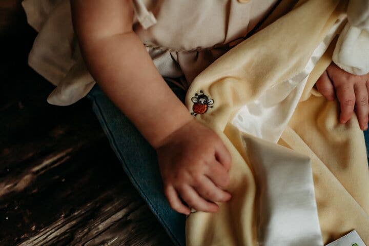 The snuggly and super soft butter yellow velour split blanket is lined and edged in silky satin for tactile development and soothing and designed with safety in mind.
