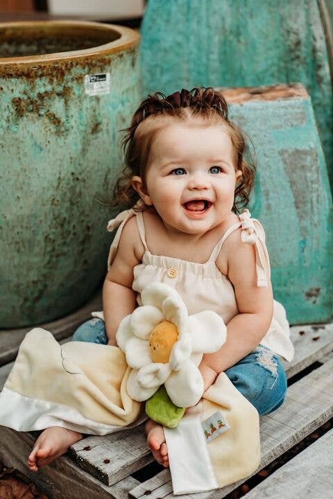 Meet our Garden Friend, Daisy Buddy Blanket! Her plush cream bloom, adorned with a embroidered face, is as endearing as it is safe for your little one. Her gentle green leaves add a touch of nature’s beauty to her design, making her not just a toy, but a companion & lovie to treasure.