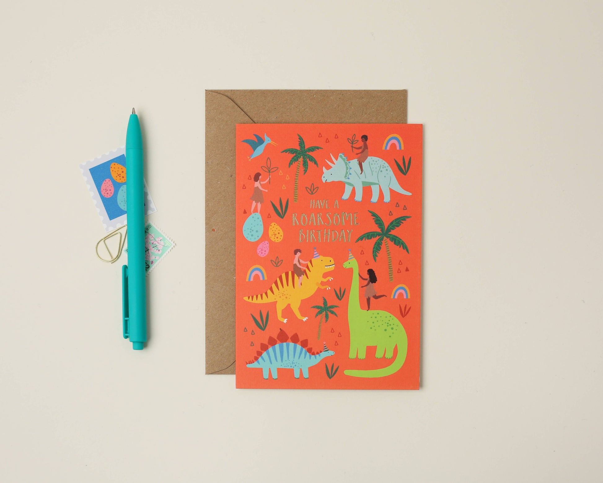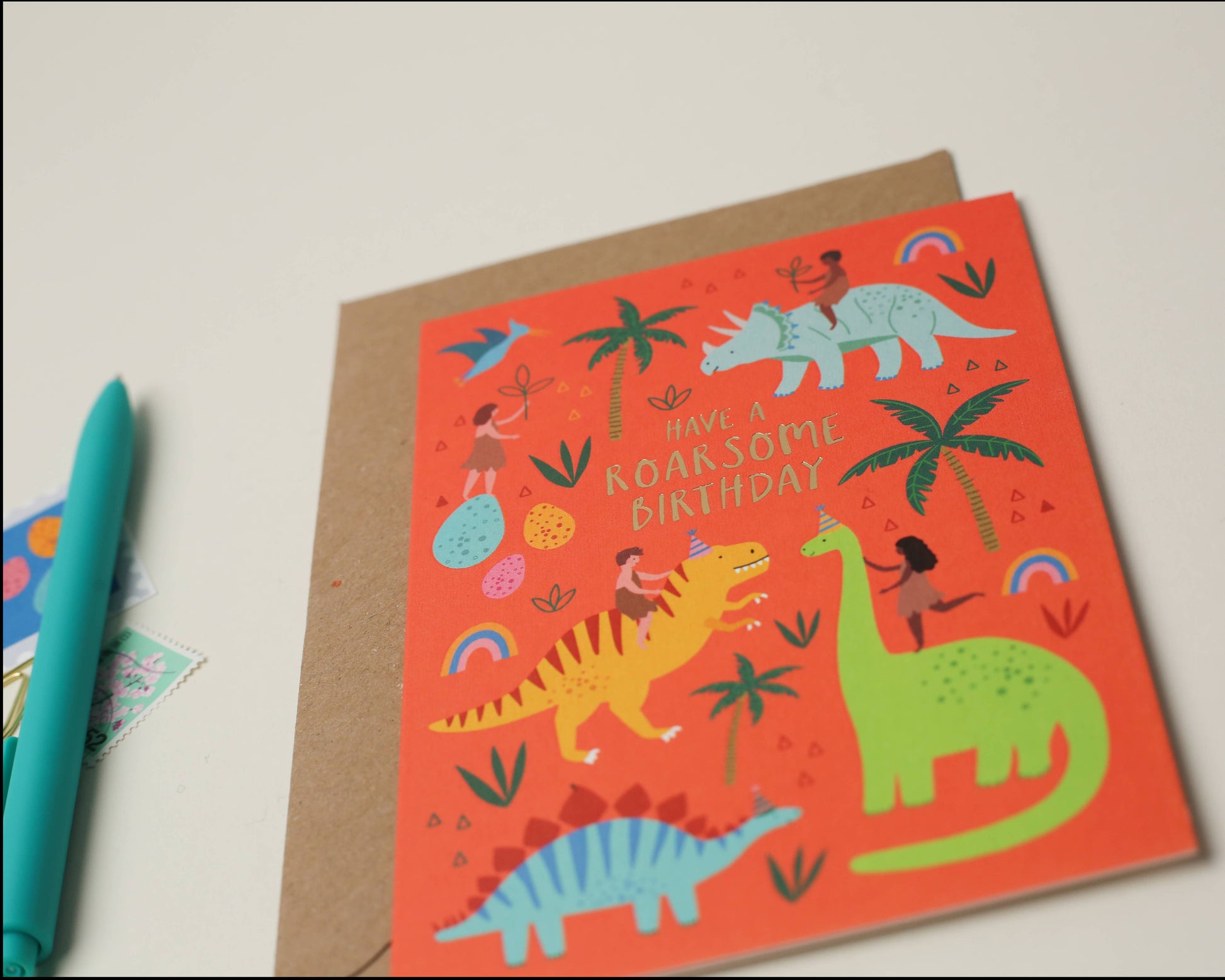 A sweet, illustrated kids birthday card features lots of different dinosaurs on a bright orange background with the caption “Have a Roarsome birthday”. This inclusive design is complete with four kids, two boys and two girls, riding on the friendly dinosaurs, as well as some colourful dinosaur eggs, palm trees and tiny rainbows. This themed children’s birthday card is perfect for the young (or old) dinosaur fan!