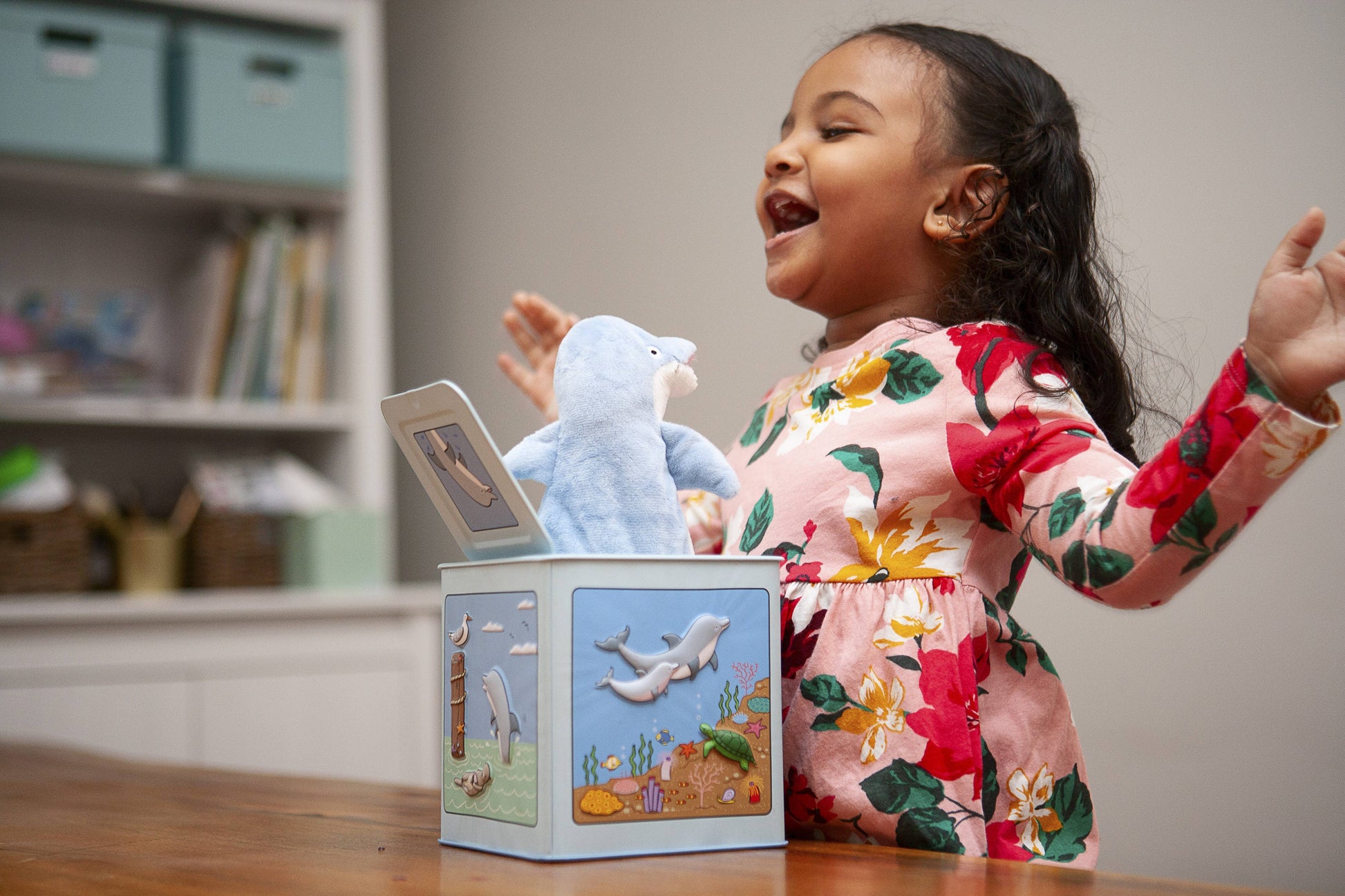 Jack-in-the-Boxes have been a time-honored favorite toy since the 1500’s! Jack Rabbit Creations creates a twist on this classic, with all original art, cuddly plush characters, and unique play-along songs. Surprise your youngsters with this cute Dolphin Jack in the Box that plays “Pop Goes the Weasel”.