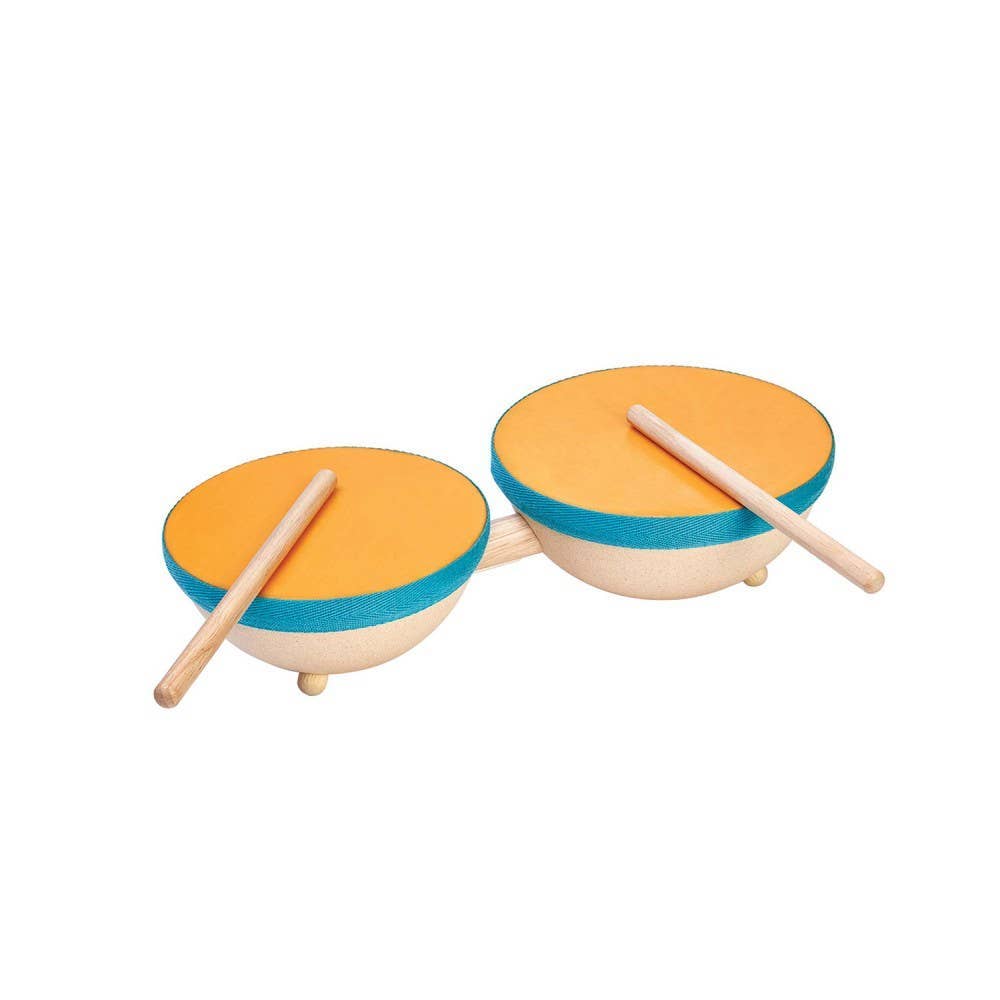 The Double Drum features 2 differently-sized drums and a pair of drumsticks. The drumhead are made from fabric coated with natural rubber, making for a gentle yet realistic musical experience