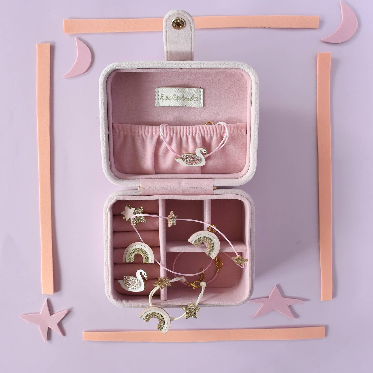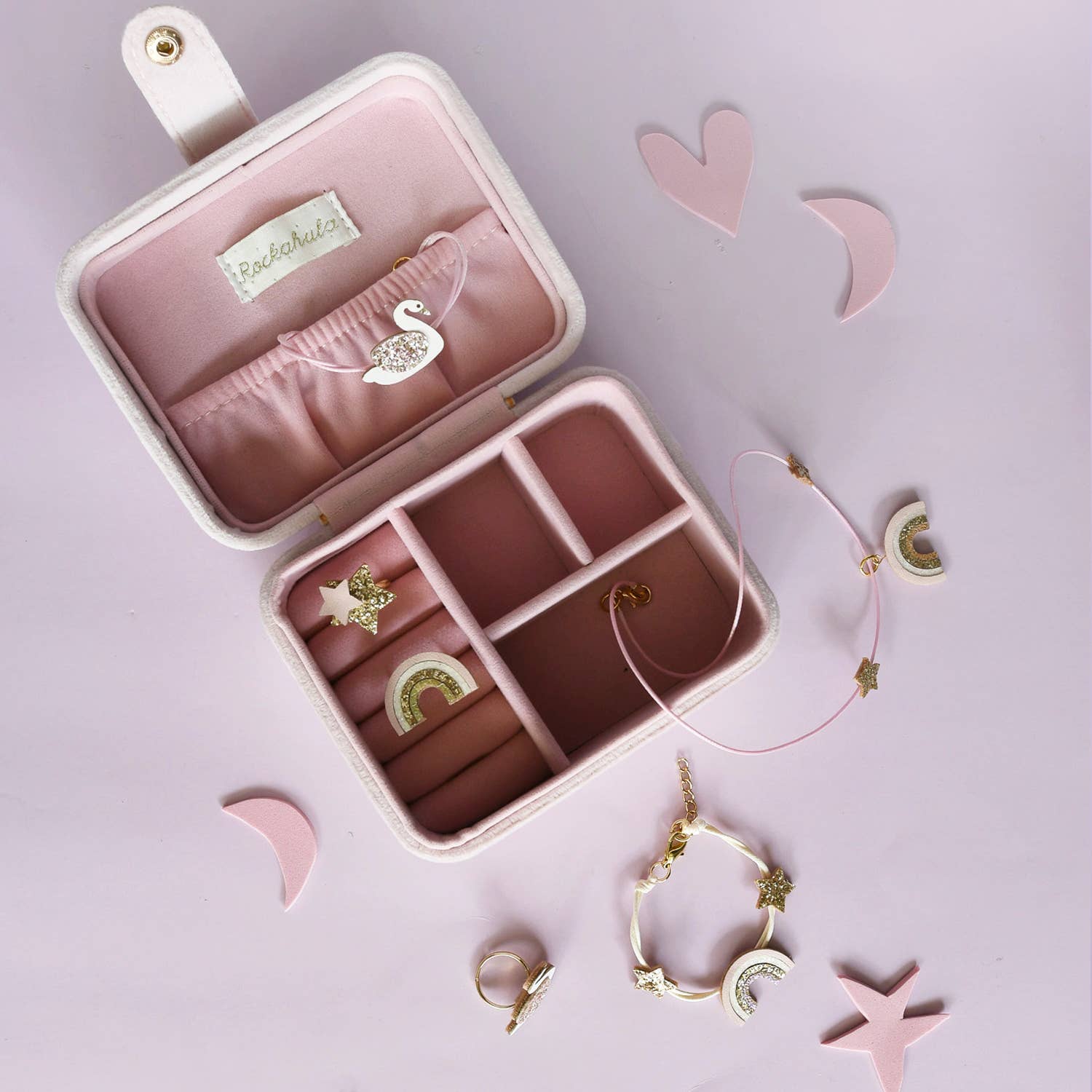 A pretty rainbow created from the softest color palette with a hint of sparkling gold and iridescent shimmer, on a pastel cord necklace. With a lobster clasp fastening and extender chain to ensure the perfect fit. Matching bracelet set, ring set, hair accessories, wand and bumbag also available. Made using recycled felt, glitter and PU. Not suitable for children under 36 months due to small parts.