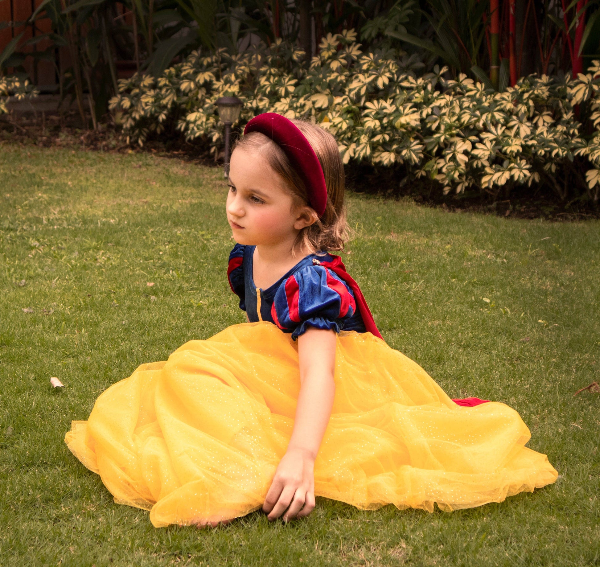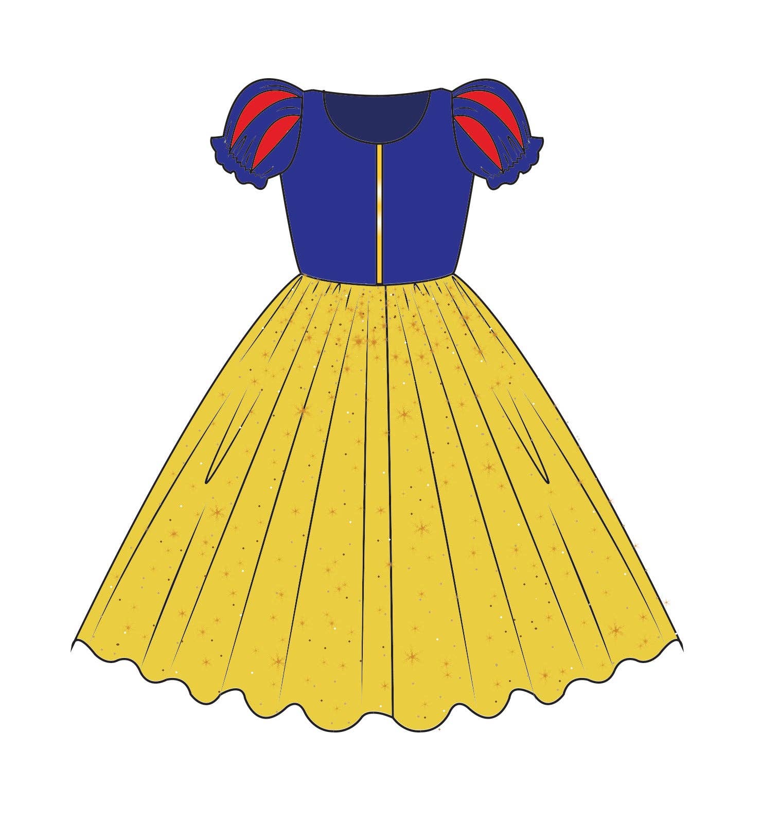 Our very own version of the iconic Snow White dress. The top part of the gown is royal blue, in soft, stretch velvet with a gold vertical trim at the center front. The full skirt is made with layers and layers of yellow sparkly tulle and lined with a cotton underskirt. - NO GLITTER MESS !!