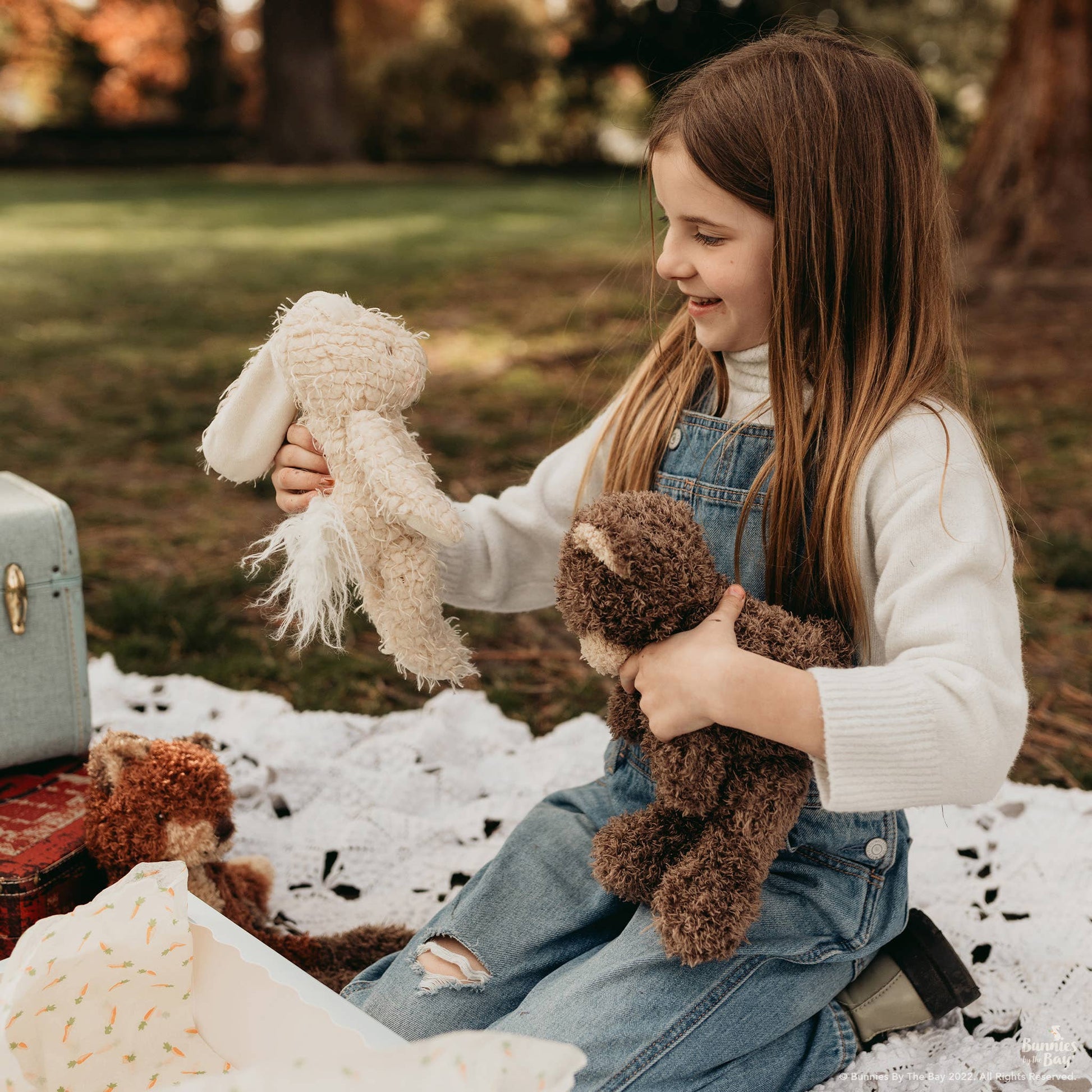 Hiding under a bush? Oh, no, not Harey the Bunny Rabbit -- he’s one of the stuffed animal gang. Warm almond scraggly fur body with handcrafted, embroidered face and a very bushy white tail. Harey is our favorite little bunny rabbit woodland friend over at Camp Cricket.
