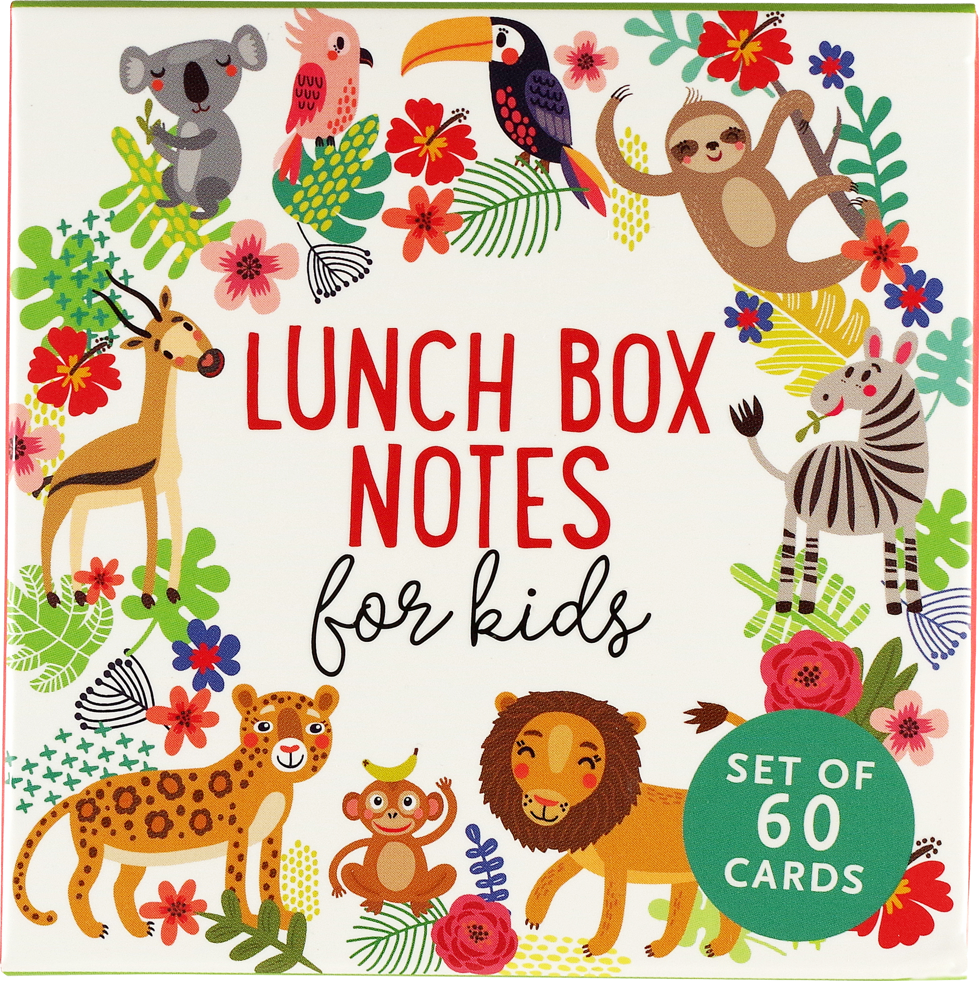 ''BEE amazing!'' ''Shine BRIGHT!'' ''SMILE!'' Brighten their day with Lunch Box Notes , featuring short, uplifting phrases and colorful pictures of favorite animals on small coated cards! 60 different cards. Fronts of cards are coated. Parents can write personal notes on the uncoated card backs for extra positivity and encouragement. Fun full-color designs. Vibrant animal artwork makes every card a delight. Cards come packaged in a reusable box. Cards have rounded corners. Cards measure 3-1/4'' square.