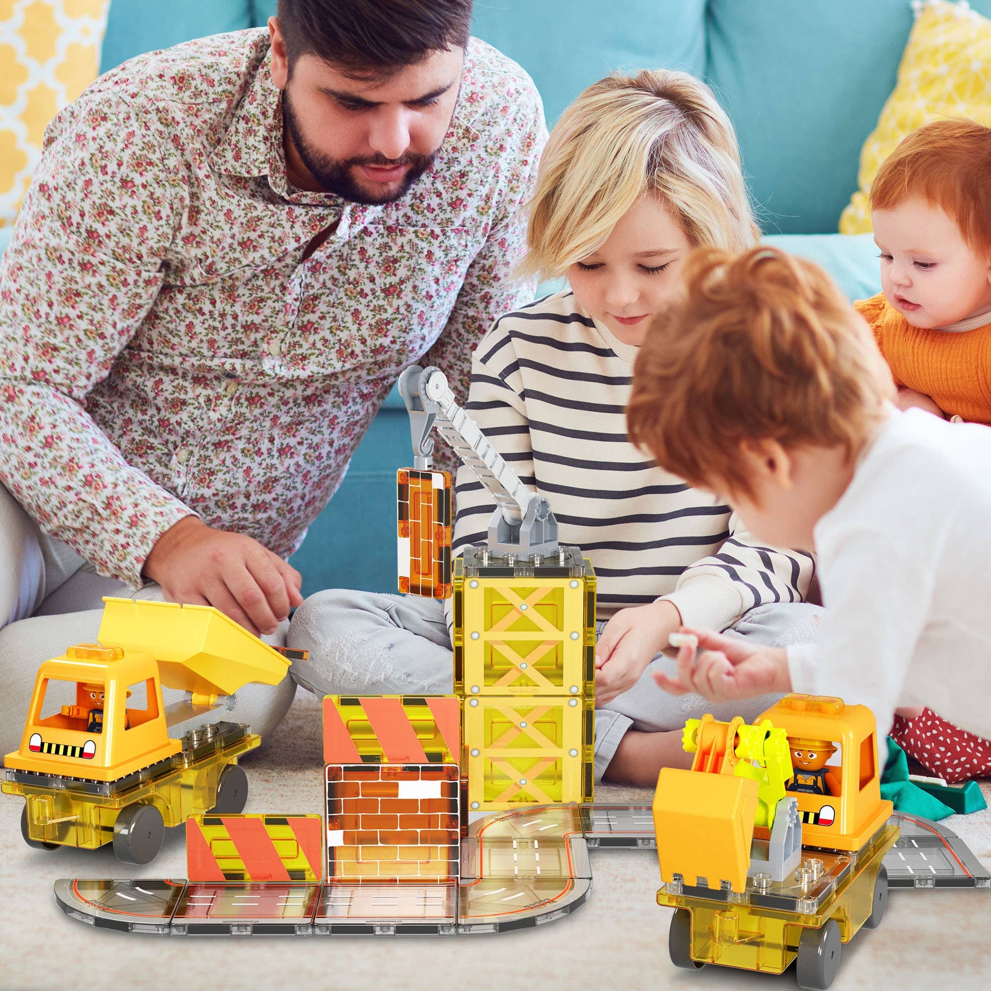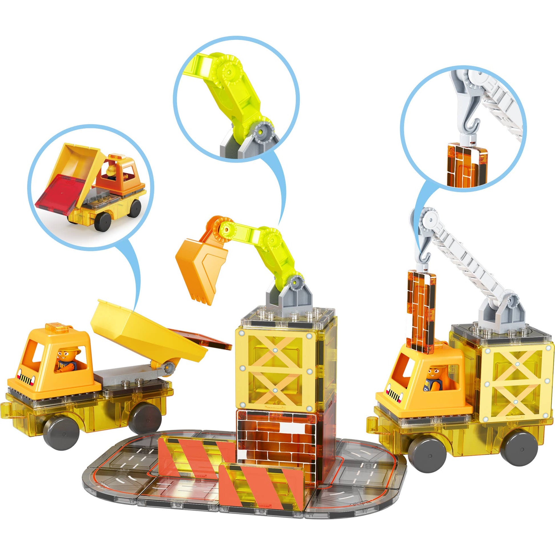 This 50-piece 5-in-1 playset is compatible with other PicassoTiles interlocking building bricks and magnet tiles educational toy set. It features 32 construction themed magnetic tiles, 2 character action figures, 2 car bases, and 14 interchangeable pieces for a crane, dump, ladder, excavator or backhoe truck. The magnetic character action figure has omnidirectional arms and legs, allowing you to rotate them around its body for more versatility, pretend and creative play.