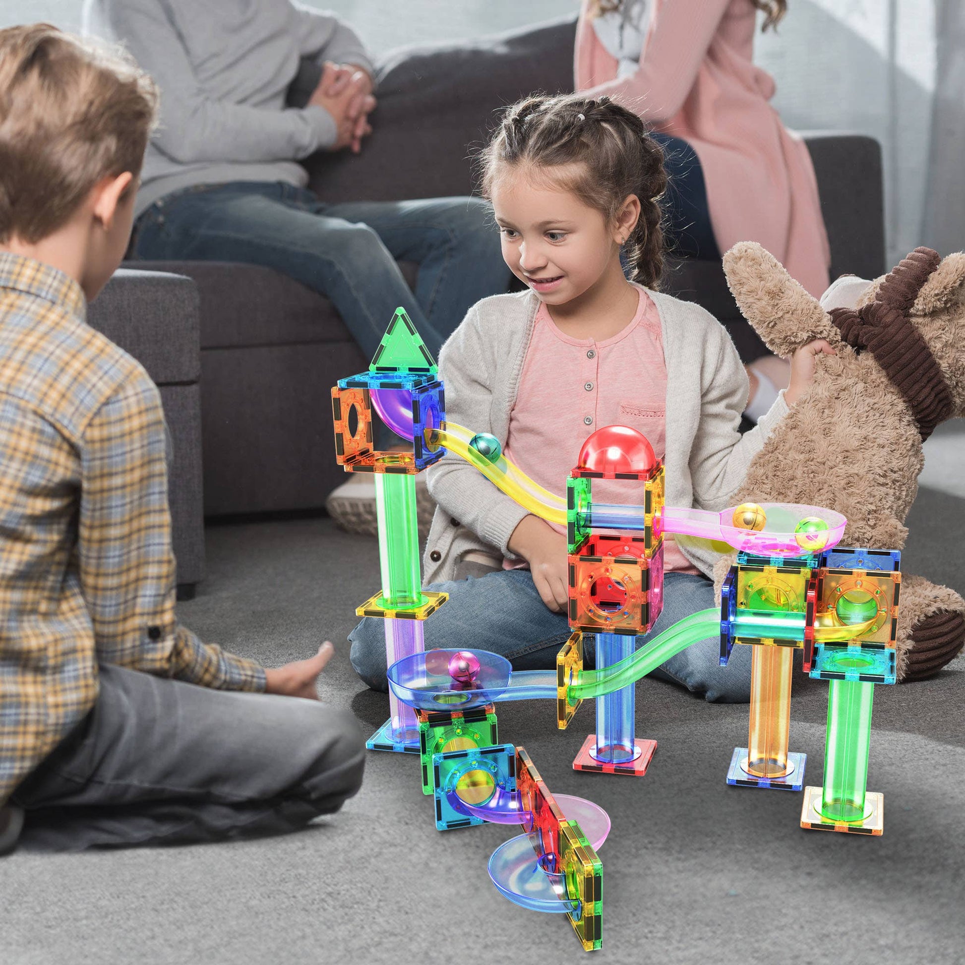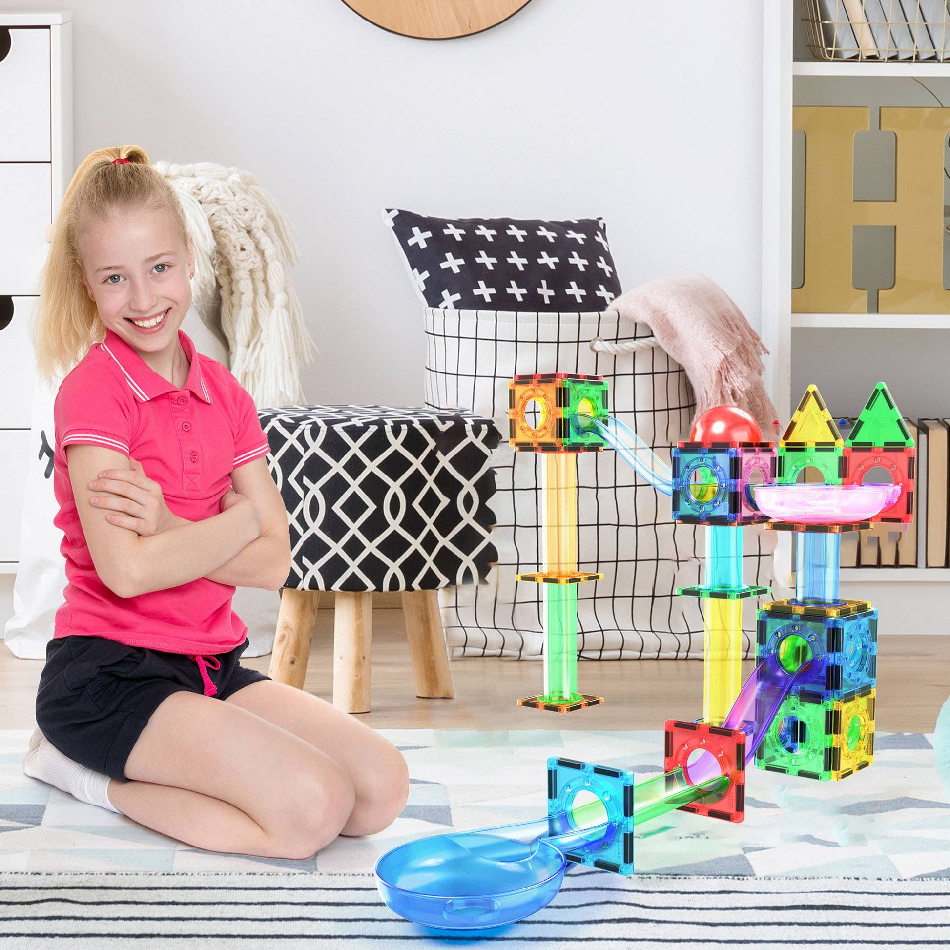Our Magnetic Marble Run Track enhances child brain development through play. The quick-connecting, magnetized, vibrant color tiles allow children to intuitively construct their designs simply while promoting problem-solving, hand-eye coordination, spatial awareness, and fine motor skills— all while playing! OPEN-ENDED POSSIBILITIES - Contains vibrant, colorful, and translucent magnetic piece building blocks and tiles that connect intuitively to allow frustration-free playtime, hand-eye coordination, motor skill training, and child brain development. Equipped with different geometric shapes, including columns, slopes, slides, funnels, U-turns, and steel-weighted marbles, the 3-D race track allows multi-layer designs that enable children to stimulate their imagination.
