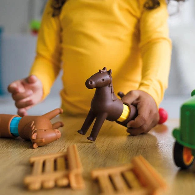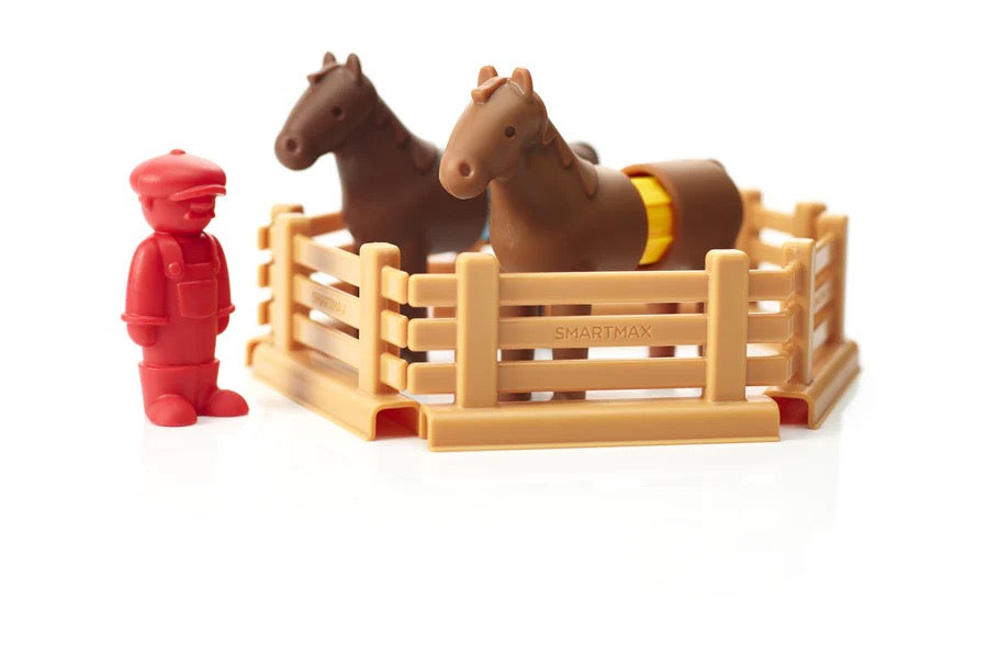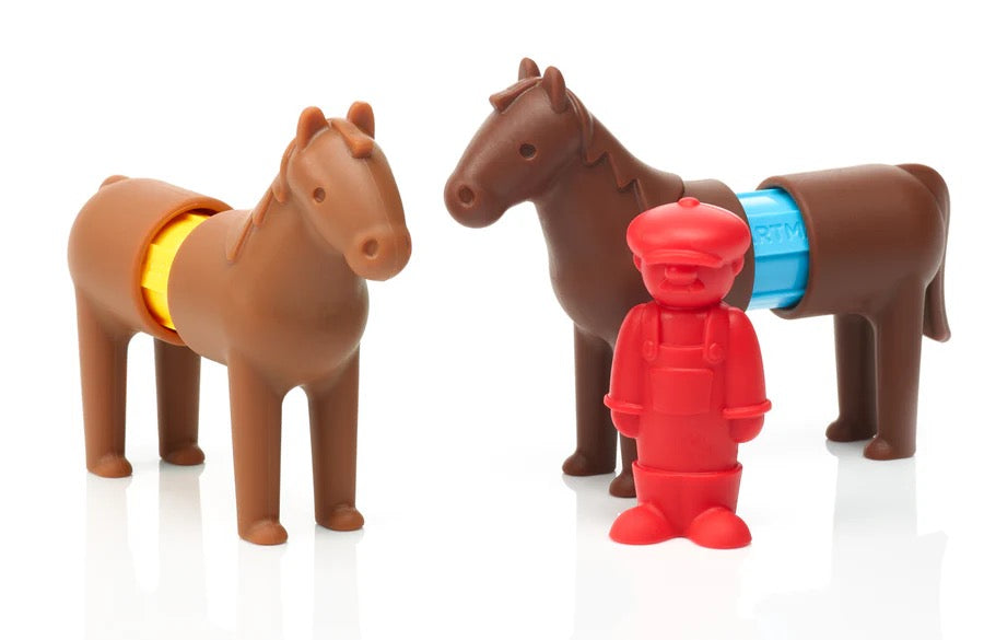 SmartMax My First Tractor Set is designed for kids ages 18 months - 5 years, offering a safe and fun introduction to STEM-focused magnetic discovery. Easily build the Tractor set and play with the horses and the farmer. The oversize parts of the tractor and the horses simply click on the bars, making them ideal for little hands. SmartMax My First Tractor Set includes 22 pieces and is compatible with all other SmartMax sets.