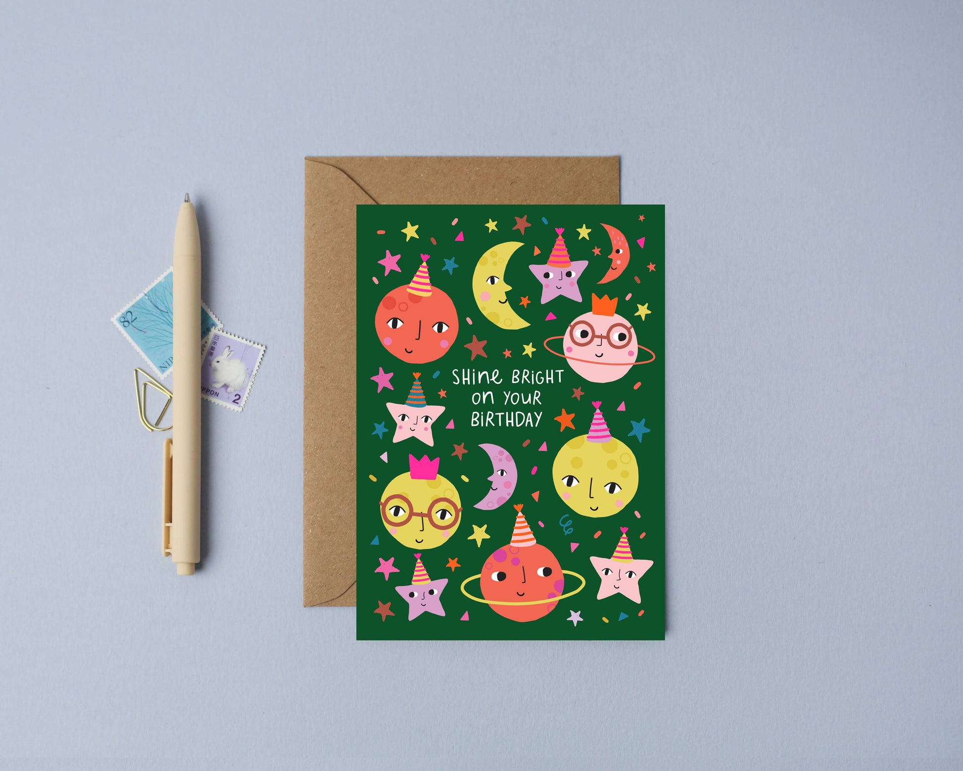 An illustrated children’s birthday card featuring lots of beautiful quirky moon, star and planet characters complete with fun glasses and party hats. Featuring pops of neon pink and orange ink, on a dark green background, this fantasy card is full of bright wonder and joy - the ideal birthday card for kids.