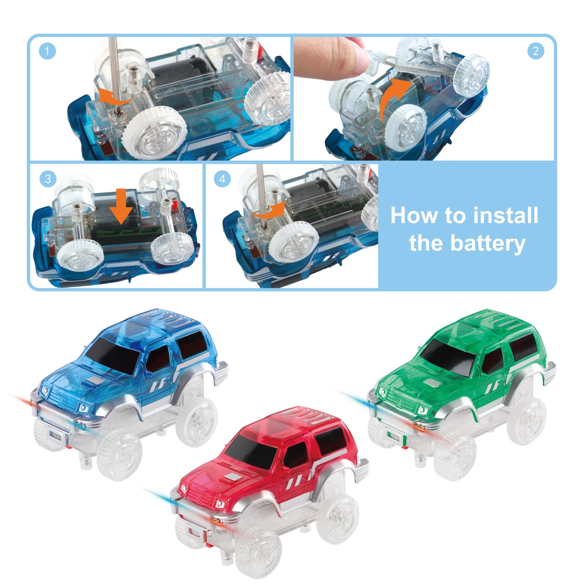 3 LED light-up cars, (1 x AA battery per car is required and NOT included)