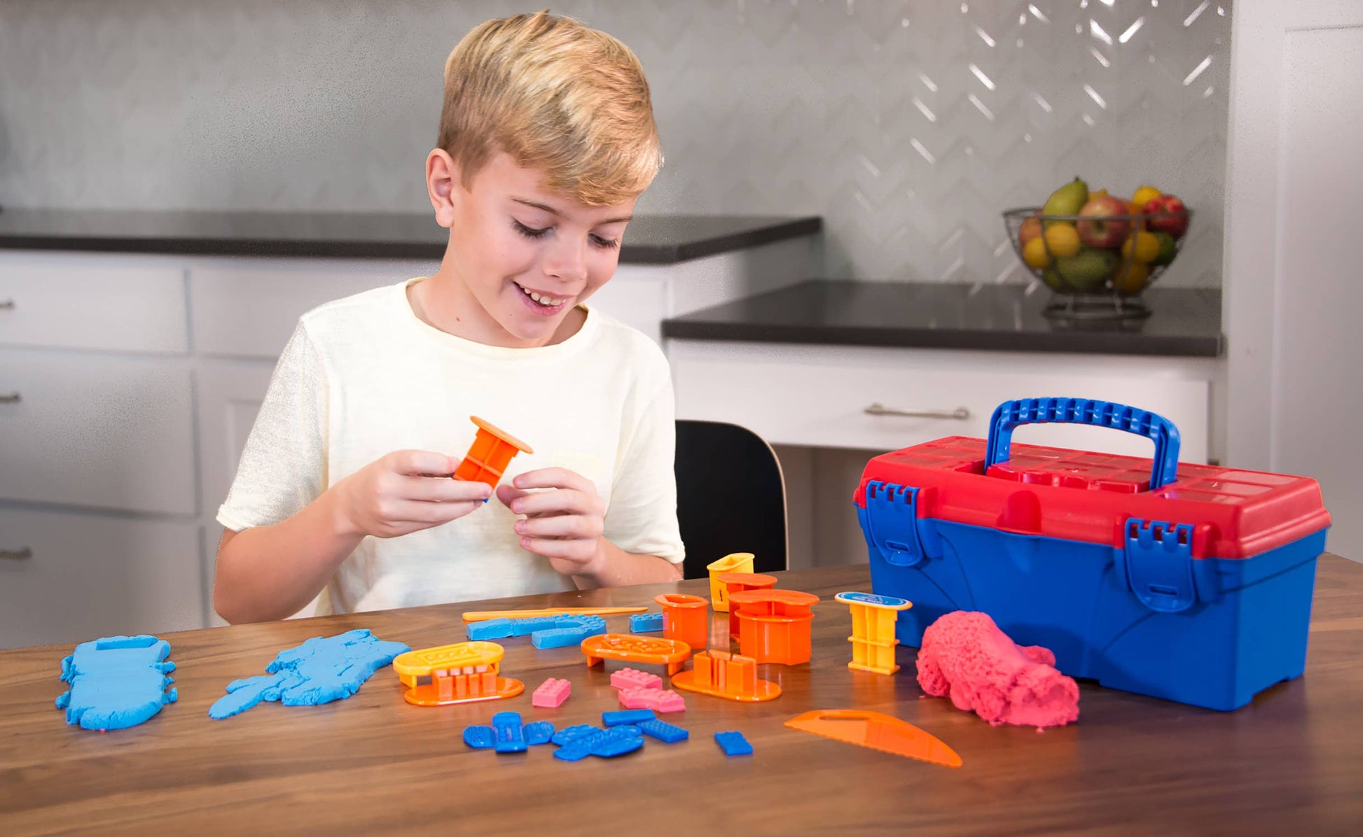 Kids of all ages will expand their Mad Mattr building prowess with the amazing Mad Mattr Tool Box! With 20 tools and two 5oz packs (Mystery colors) of Mad Mattr included in the portable toolbox, there are endless ways to maximize your construction play. Press it, mold it, squish it, and sculpt it. What will you build?