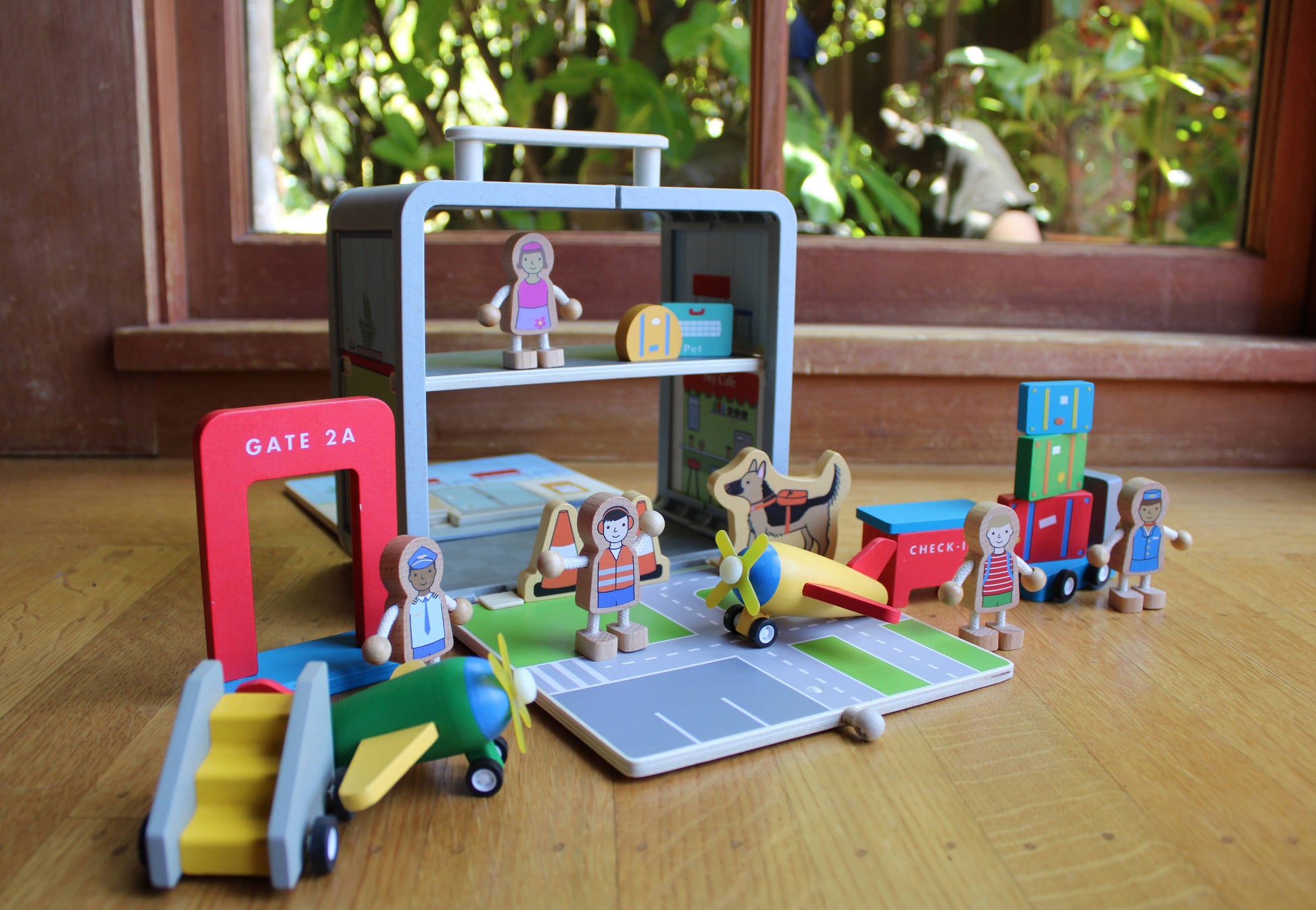 Our Suitcase Series encourages portable play and imagination-on-the-go. Each wooden suitcase opens up to a world of fun. The 18-piece Airport has everything you need for hours of fun, including planes, pilot, travelers with luggage, and more!