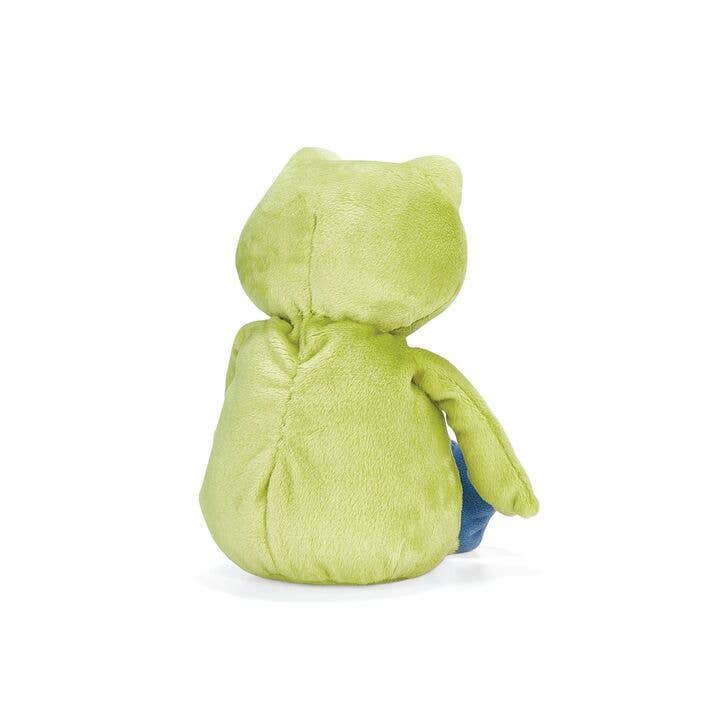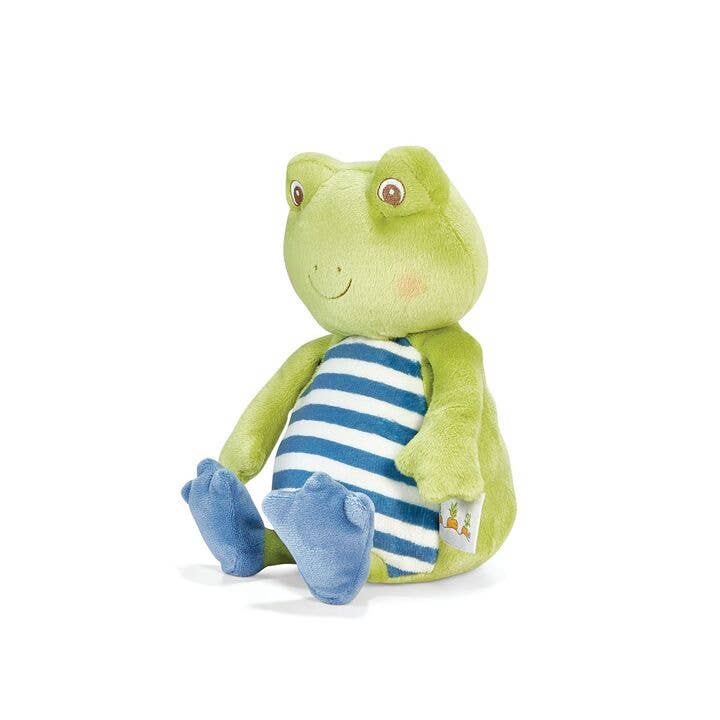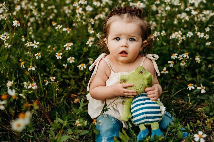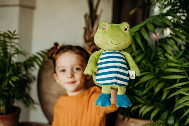Tadbit Froggie, the delightful stuffed animal garden friend that’s as charming as a sunny day by the pond. Tadbit boasts a warm green velour body that’s as inviting as a lush garden in spring. His blue and cream striped belly adds a touch of playful contrast, while his cute blue feet bring a splash of color!