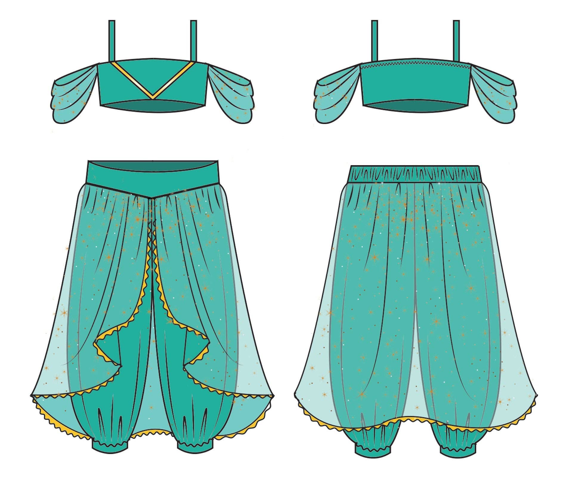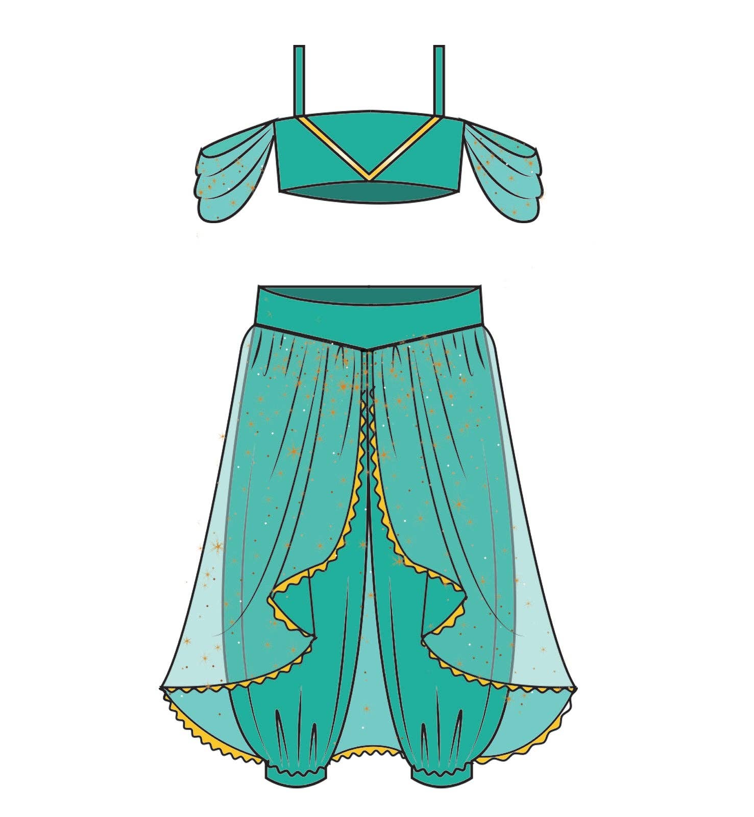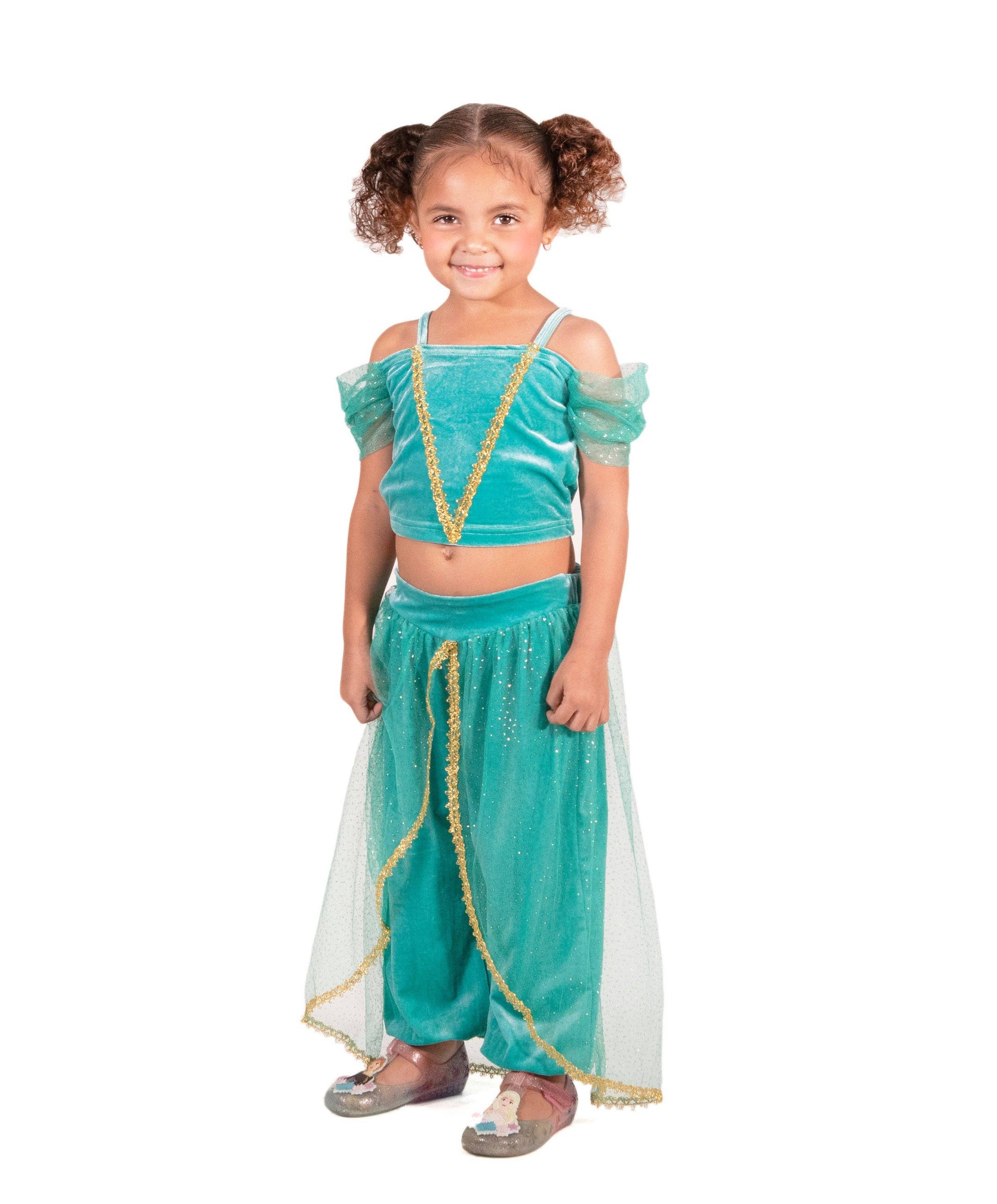 We designed a beautiful (and always soft and comfortable) two piece outfit for our Aladdin Princess. The top part is made with stretch velvet and off the shoulder tulle sleeves; the pants are also stretch velvet with an elastic waistband (for easy dress-up) and the last magical touch is an open front tulle skirt that shimmers on top of the pants. Slim fit, size up for a looser fit.