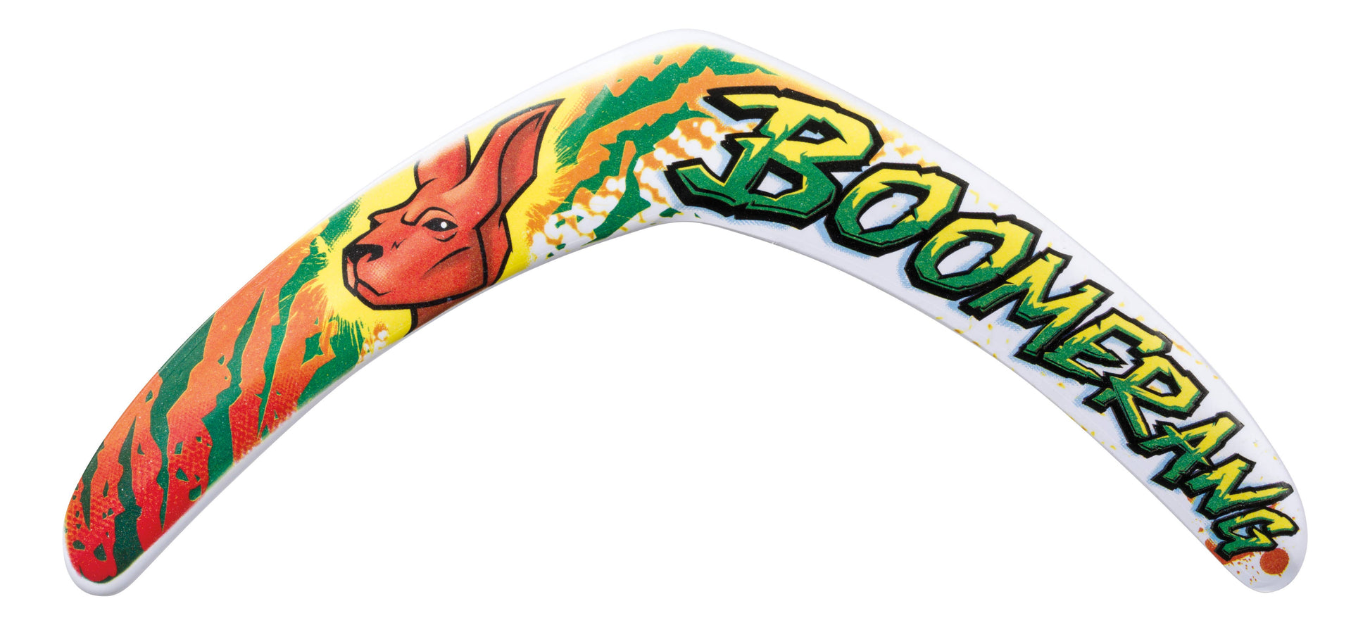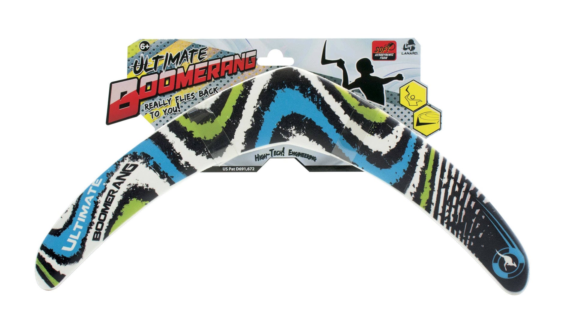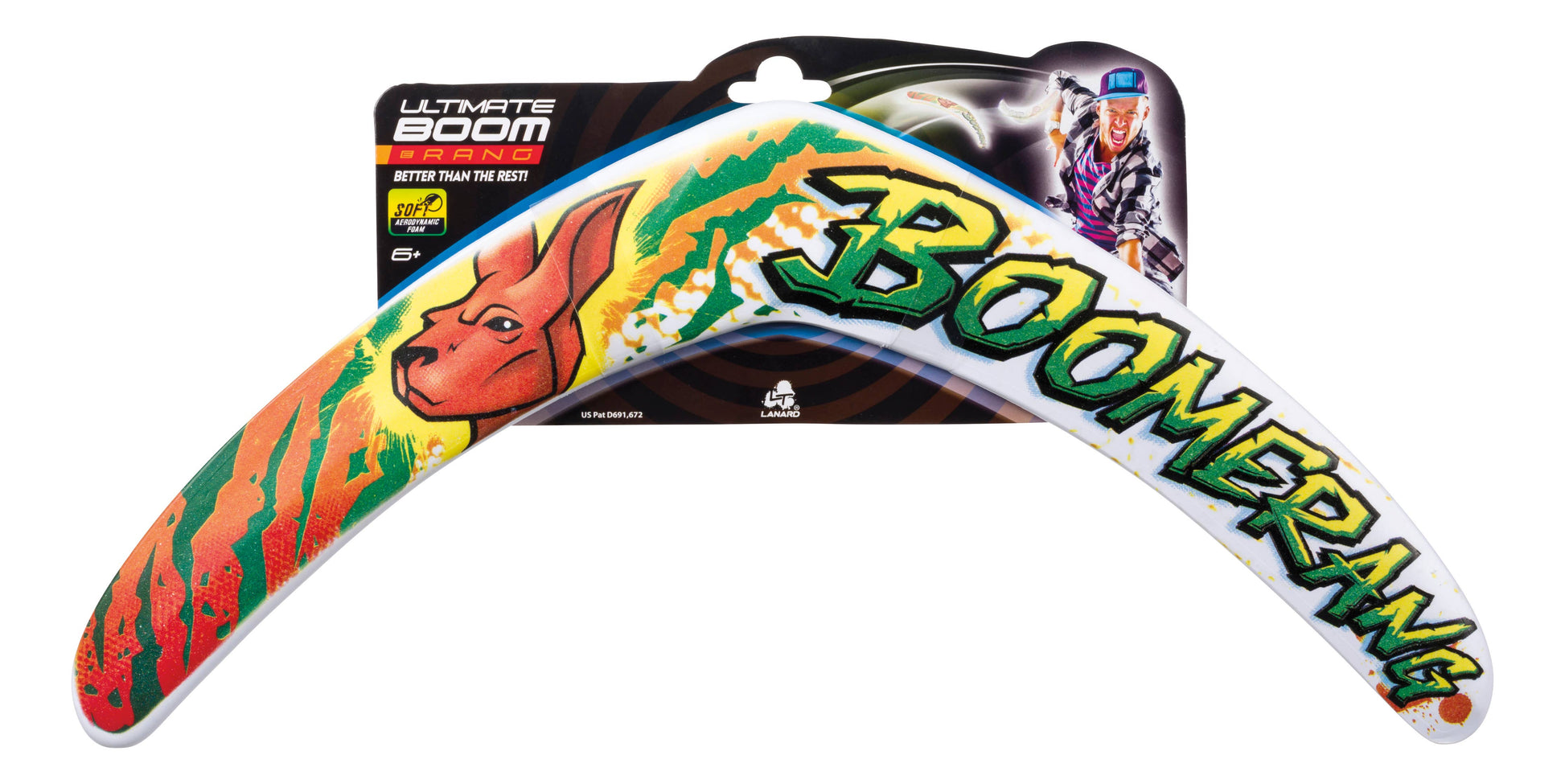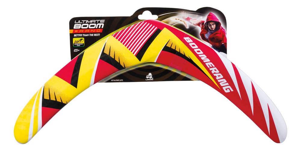 Designed for outdoor use, this 13.5-inch boomerang toy is one kids will want to have at home and take on vacation. This is a perennial bestseller due to its soft foam material, ability to float, vibrant 2-toned marbled coloring, and fun geometric designs. Comes in an assortment of mixed neon colors, including blue, turquoise, yellow, and orange. Individually packaged in a peggable cardboard card.