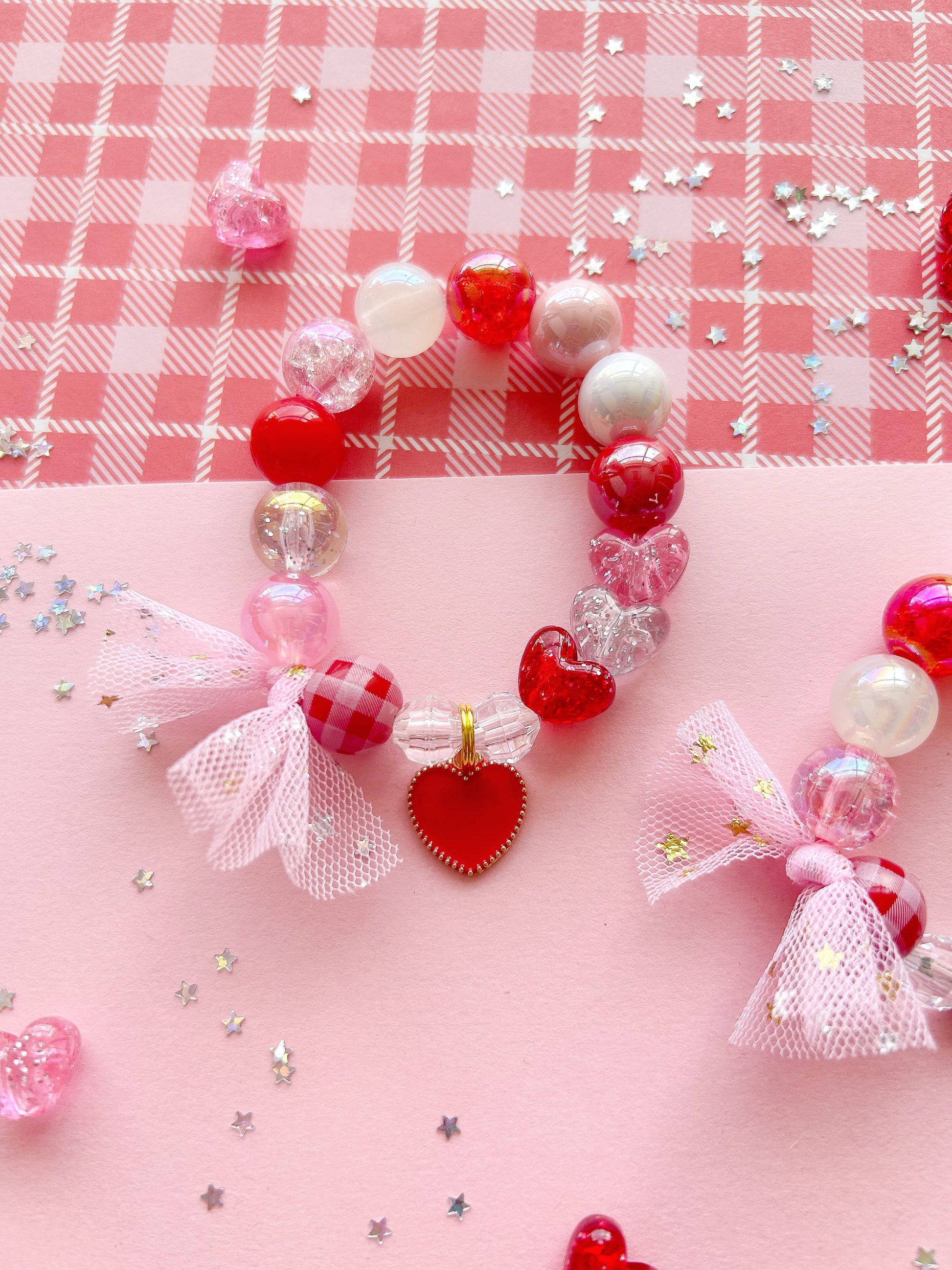 Bracelet made with 8mm and 12mm acrylic beads, one enamel charm, and an optional tulle knot, strung on stretch cord. Choose personalized or non personalized. *Beads in bracelet may vary depending on length of name and size of bracelet. Handle our jewelry with care. Keep away from water, lotions and cosmetics. Our jewelry contains small parts and is designed for kiddos 3 and up. Never leave children unattended while wearing jewelry.