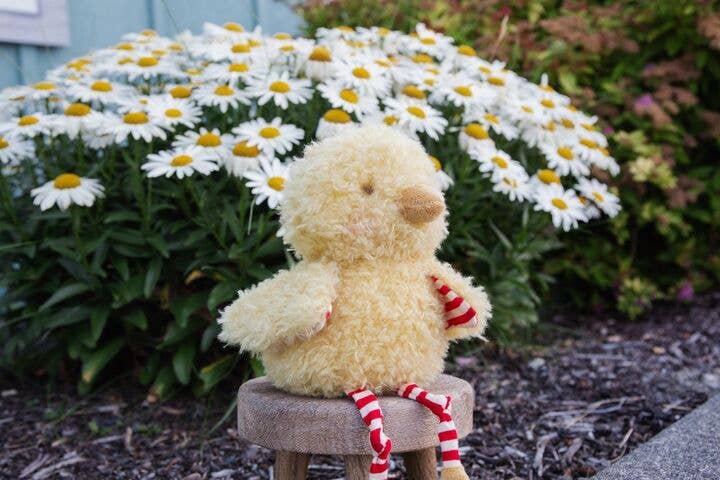 This darling chicken stuffed animal has a shaggy yellow fur body with striped, red & cream knit legs that dangle, and cute orange feet and beak for an extra pop of fun and color. Clucky's hand-embroidered eyes are safe for even the littlest of farm animal friends.